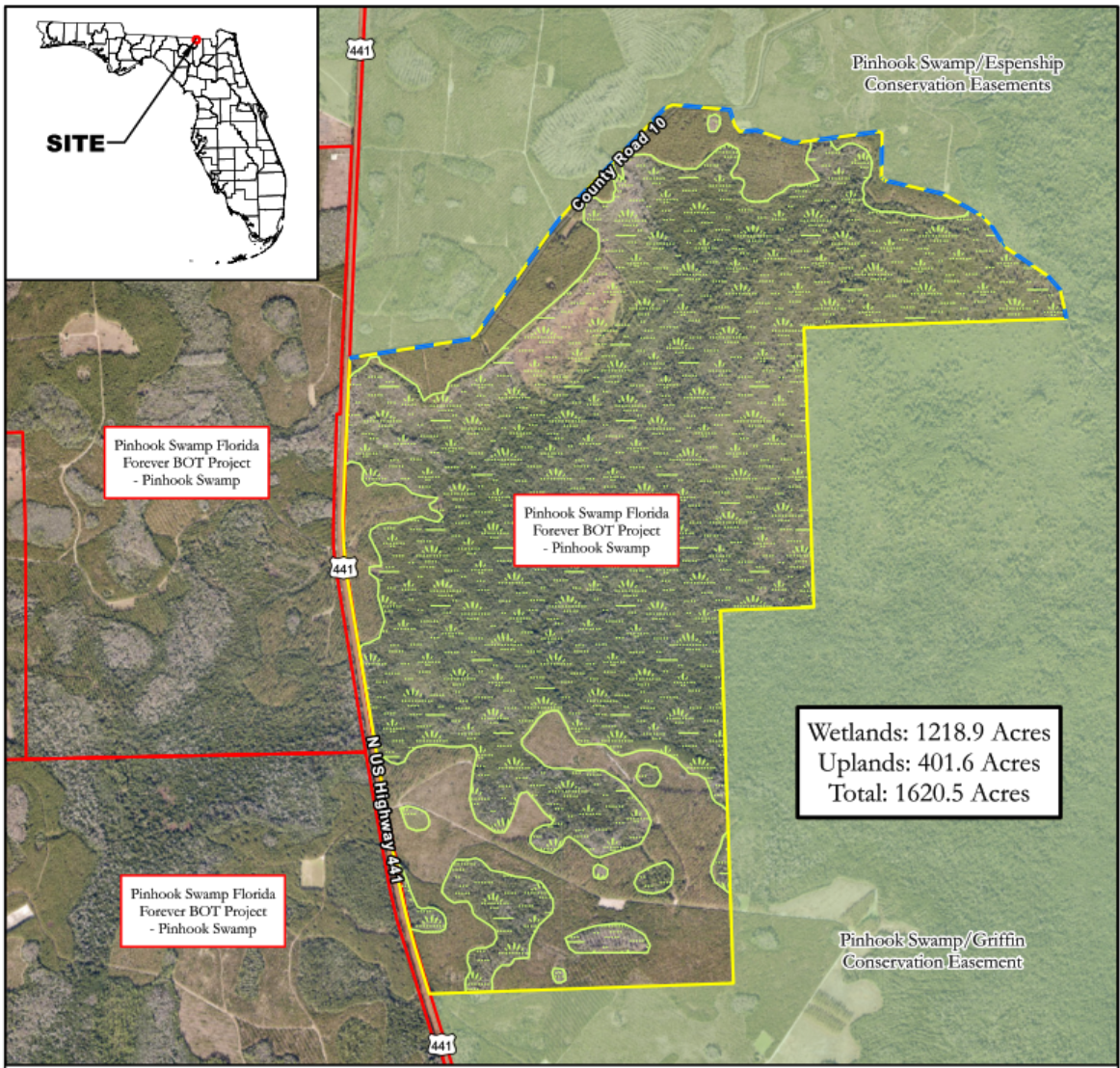 Degrove Surveyors was selected by the Florida Department of Environmental Protection’s Division of State Lands to perform a comprehensive boundary survey and legal description of the Lord Parcel, a 1,620.46-acre tract within the Pinhook Swamp Florida Forever Project area in Columbia County, Florida. The property adjoins state-managed conservation lands and serves as a critical ecological connection between the Osceola National Forest and the Okefenokee Swamp ecosystem